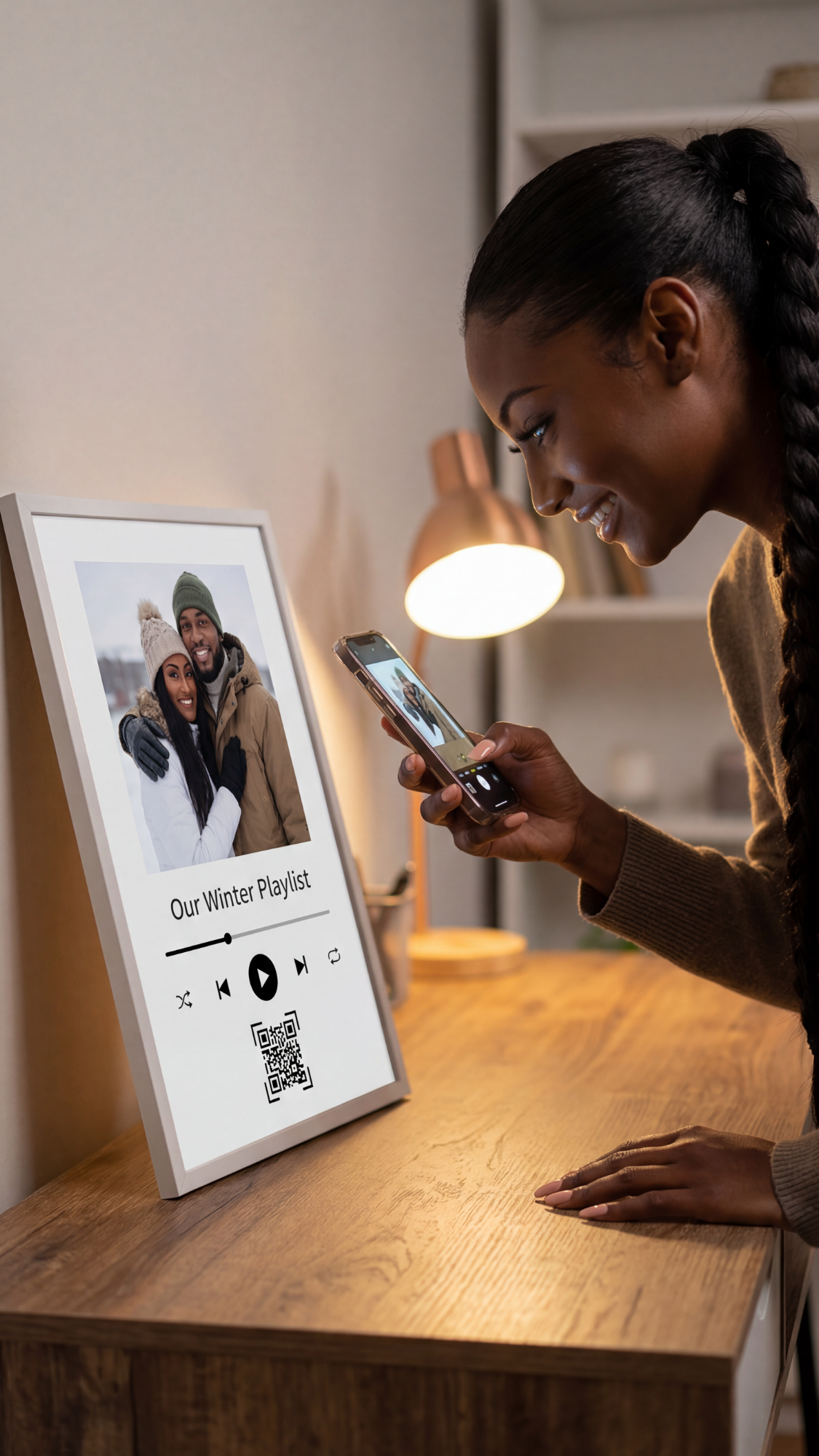 The idea works in two main versions: playlist plaque or single-song plaque. A playlist plaque features your couple photo or a moody winter scene with a scannable code that opens a playlist titled something like “Cozy Nights With You.” A single-song plaque focuses on one track that defines a moment—first drive, first kiss, or that one night you both still reference. Both versions count as a DIY song plaque for boyfriend, and both create a quick shortcut straight to the soundtrack of your relationship.