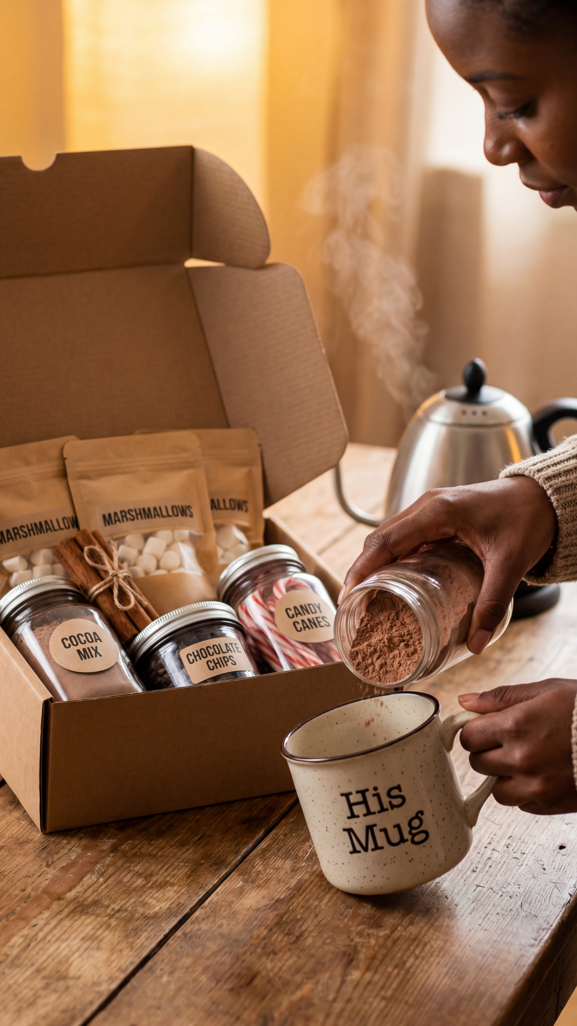 To keep the vibe fun, you lean into flavor themes instead of random chaos. You create a S’mores Cocoa Bar with mini marshmallows, graham cracker crumbs, and chocolate chips. You build a Peppermint Cocoa Bar with crushed candy canes, peppermint syrup, and dark chocolate chunks. You try a Spiced Winter Cocoa Bar with cinnamon sticks, a tiny jar of chili powder or cayenne, and a hint of vanilla. Themes help him decide quickly and make the whole box feel curated, not thrown together five minutes before he walked in. Ever notice how a name on something makes it feel instantly fancier?