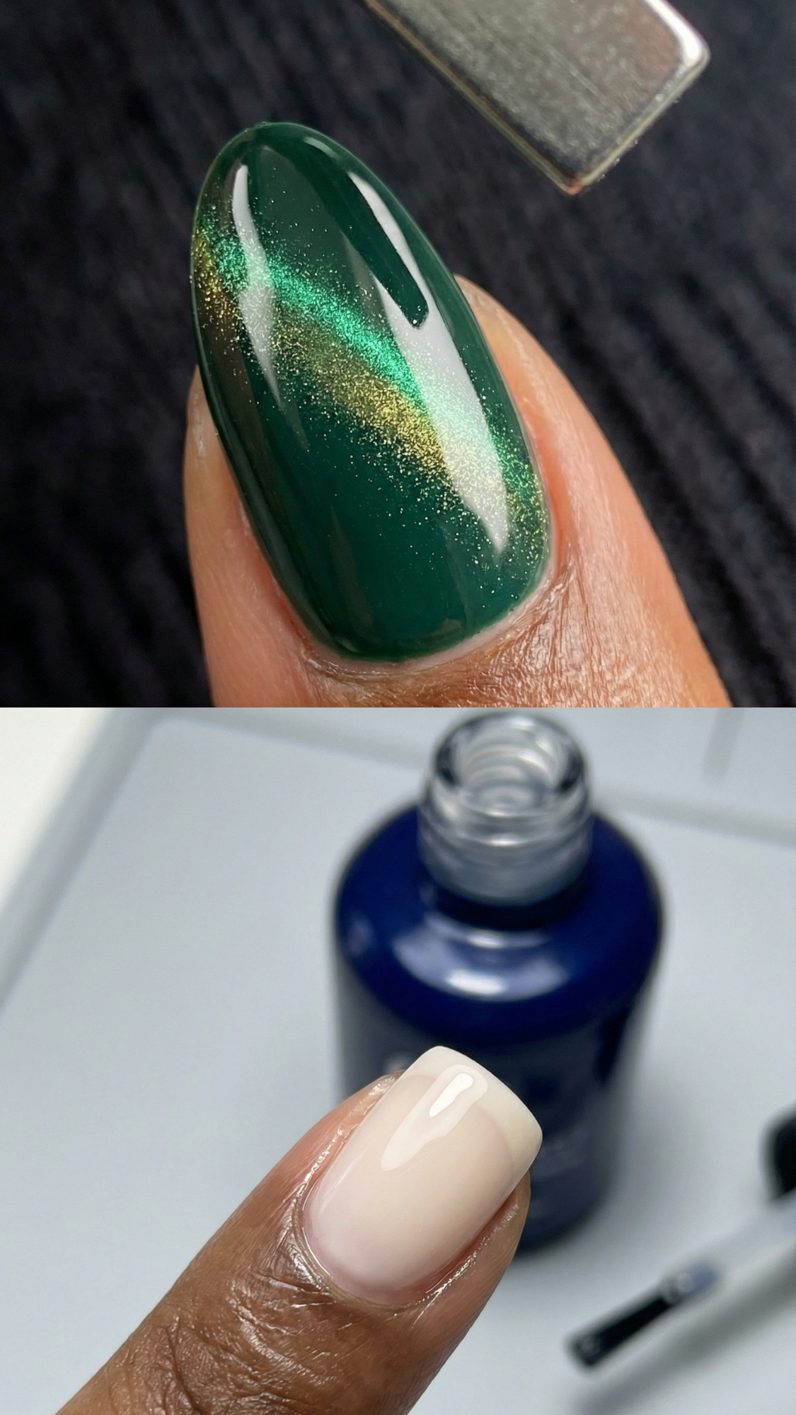 - Velvet / Cat Eye: dark base, magnetic coat, hold magnet 30–45° for 2–3 seconds per nail, cure, gloss.