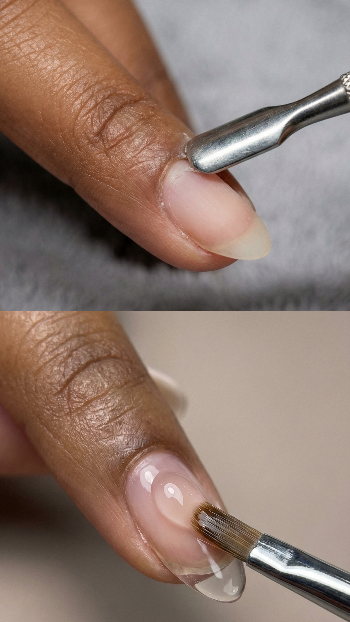 - Base: float a thin rubber base and cap the free edge. Flash cure if you build a tiny apex on weak nails.