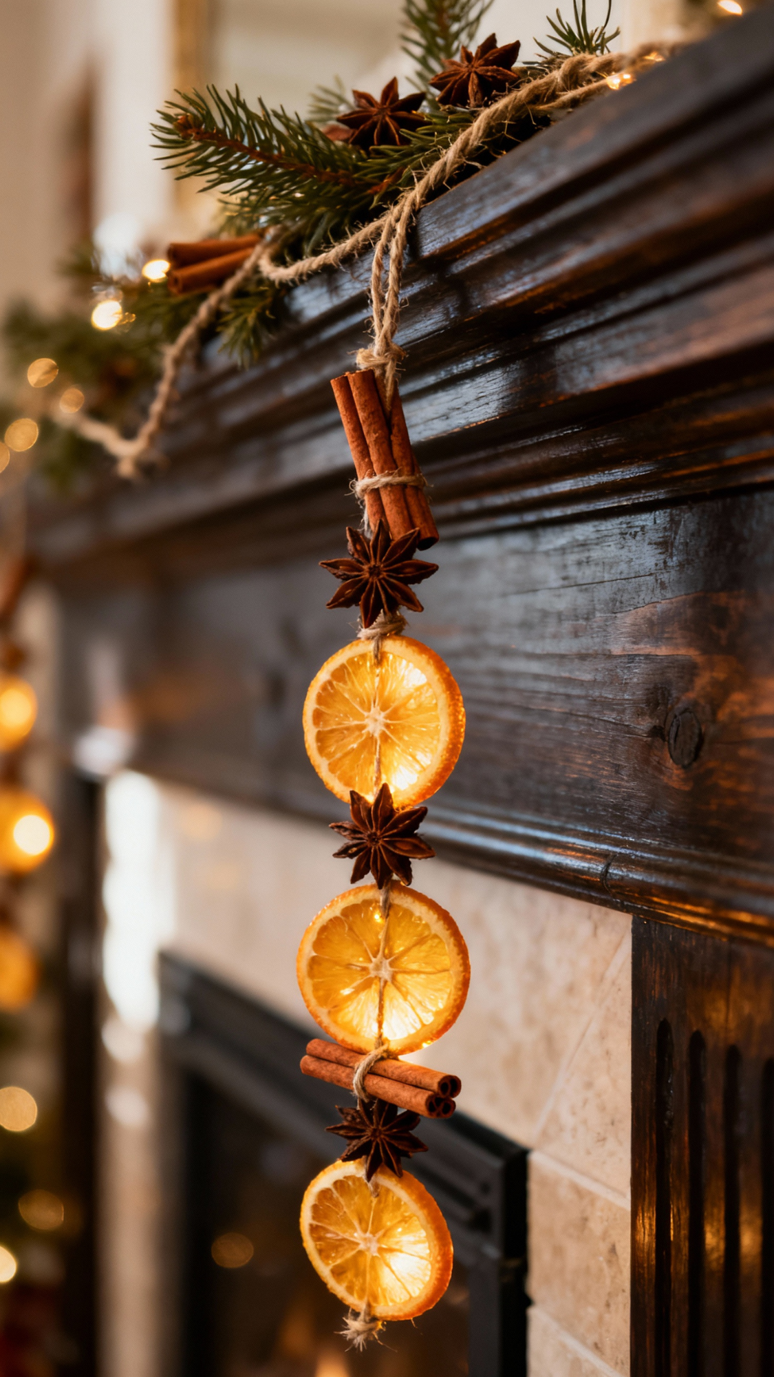 • Wood, nature, and “homey” textures: wooden ornaments, dried citrus, greenery, linen, and kraft paper that keep everything grounded and calm.