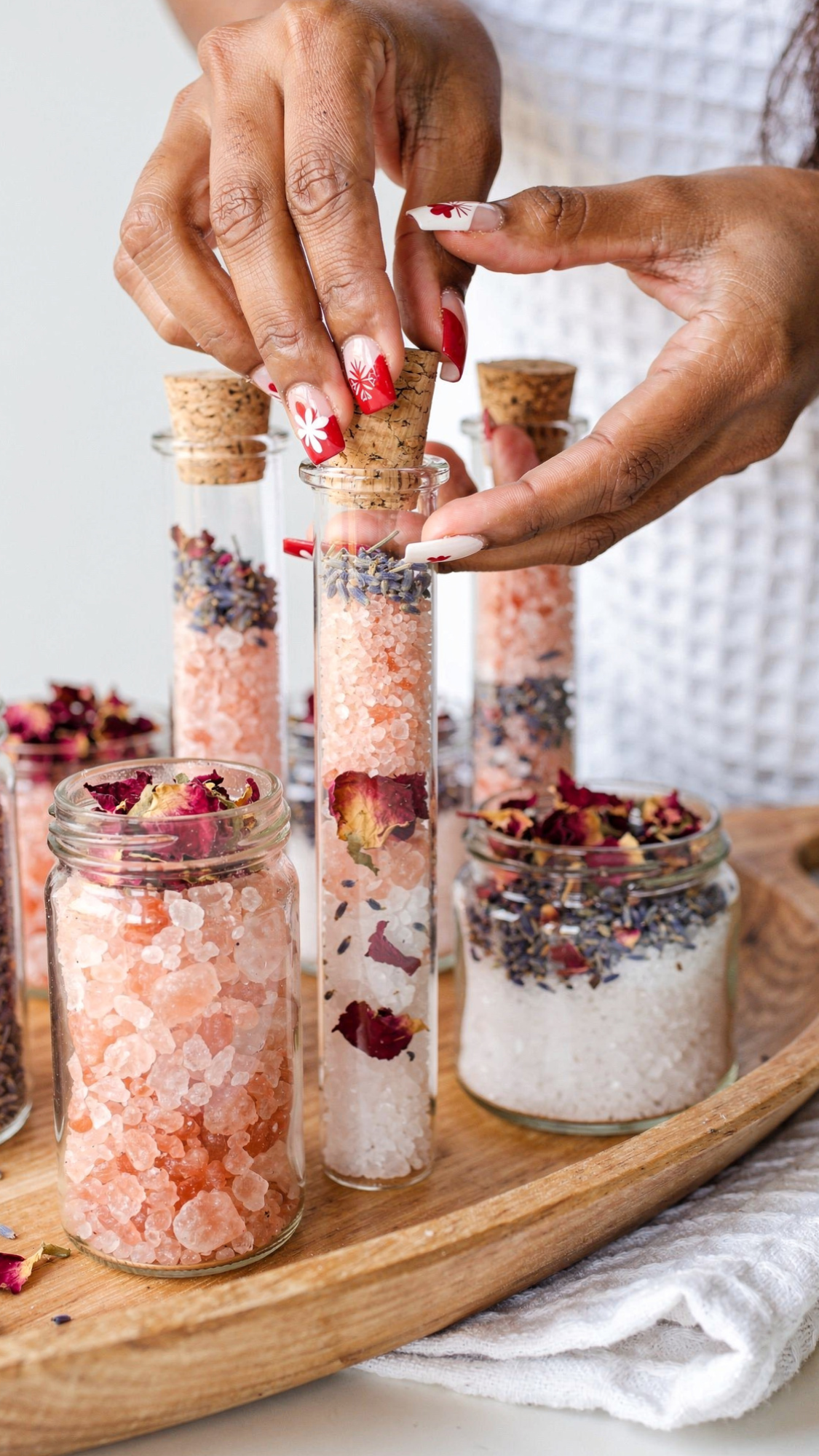 Bath salts count as classic spa craft energy because they look pretty and work hard. You combine Epsom salt with a carrier oil and a few drops of essential oil, then stir in extras like dried rose petals, lavender buds, or citrus peel. Clear glass test tubes or small jars show off the texture and color, so the gift already feels luxe before anyone opens it. Simple labels with names like “Deep Sleep Soak” or “Stress Melt Bath” keep everything fun and easy to grab on a rough day. You can group a few tubes in a small box or tie them together with ribbon for a ready-made spa set. For anyone who lives in their bathtub once temperatures drop, this craft basically hands them their favorite season in jar form.